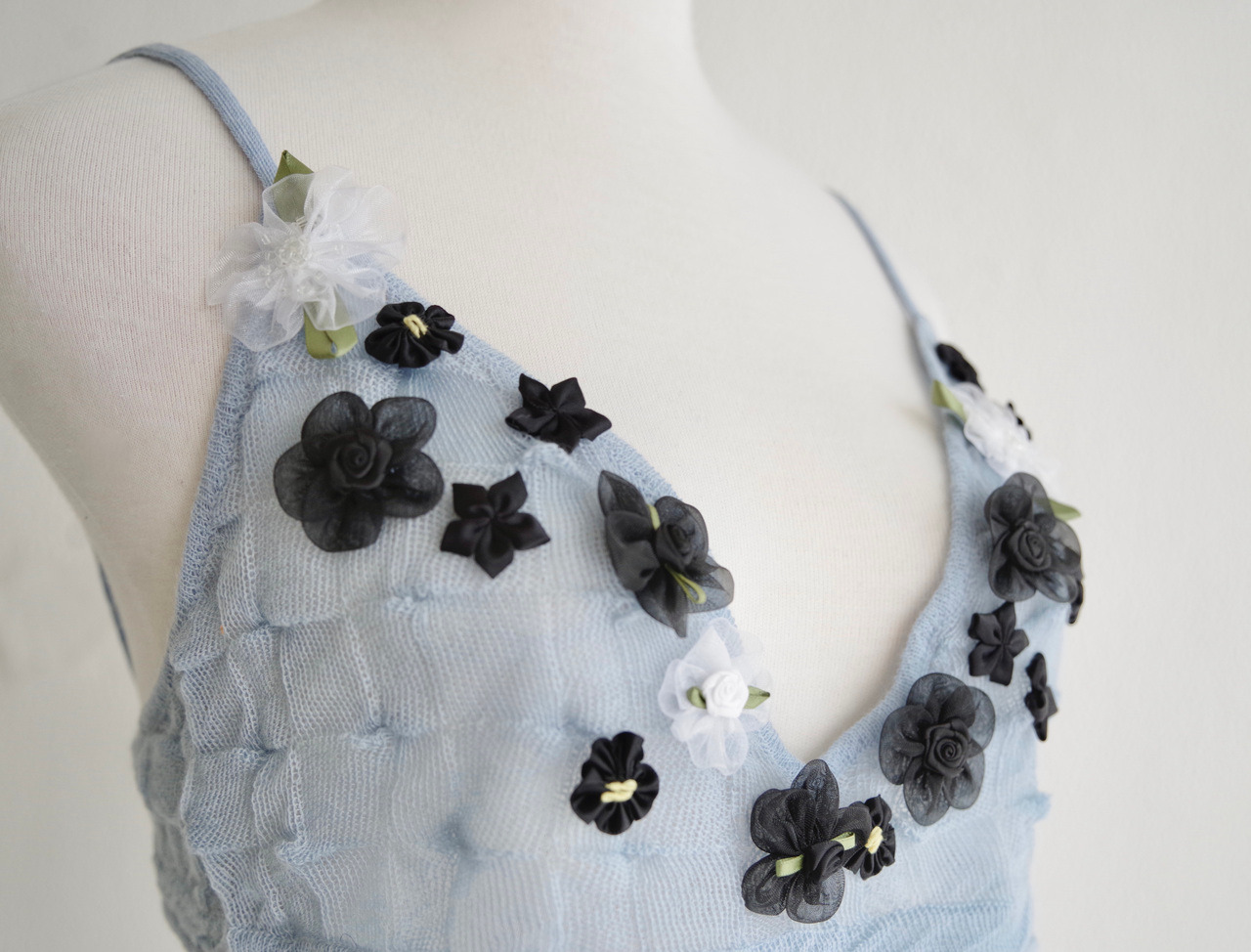 點綴品牌標誌性的手工綁製與刺繡絲帶花朵,細節精緻。