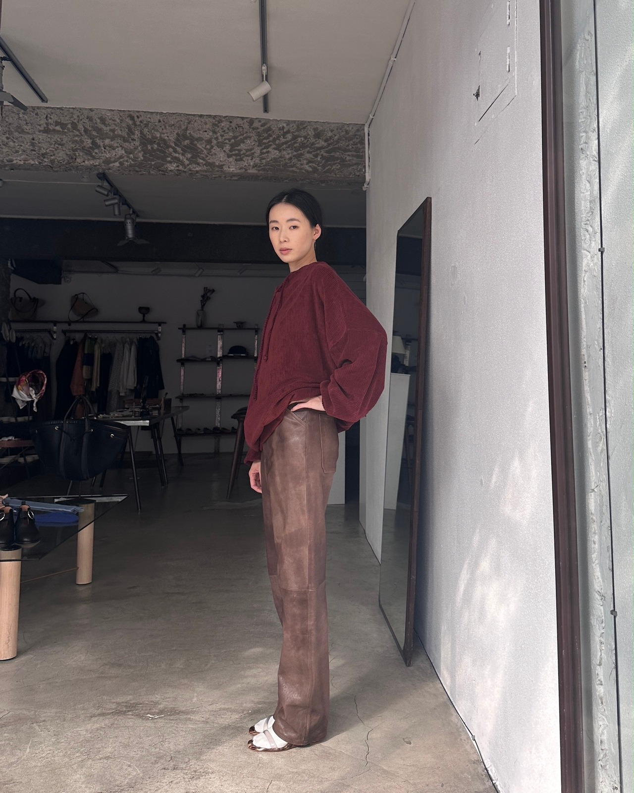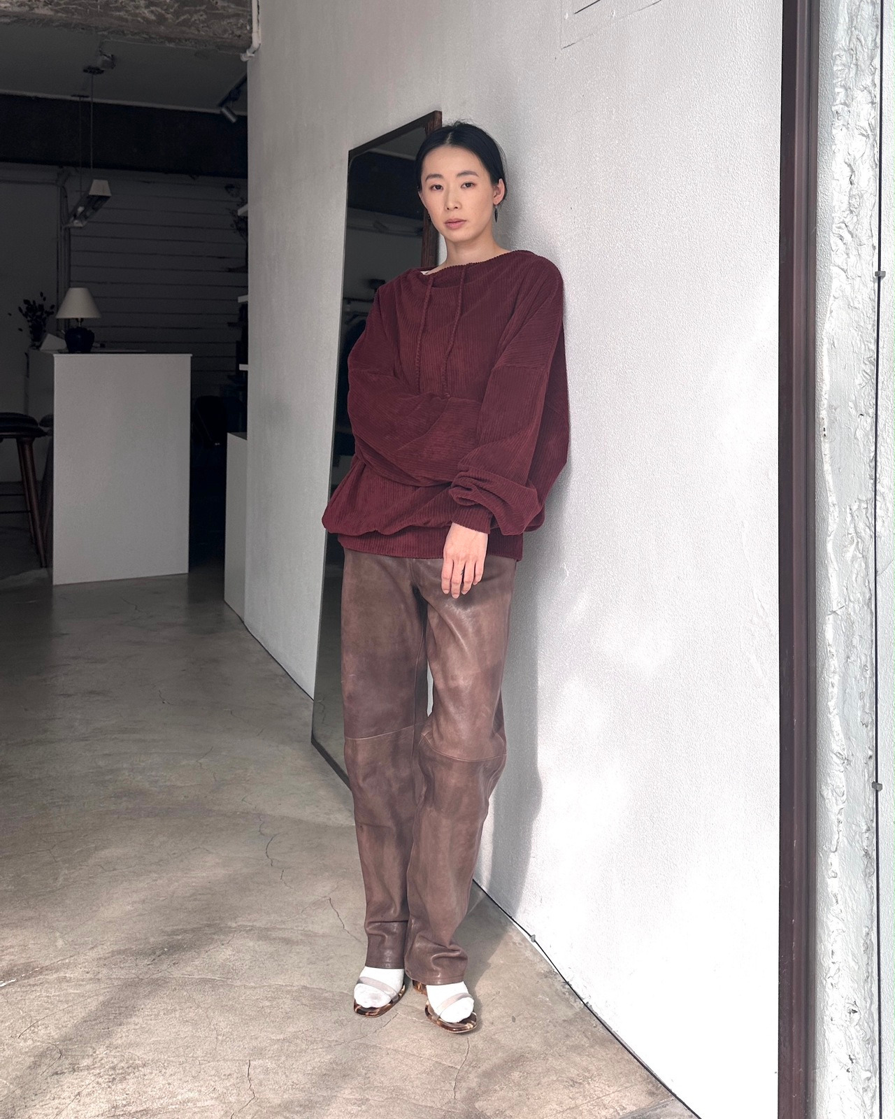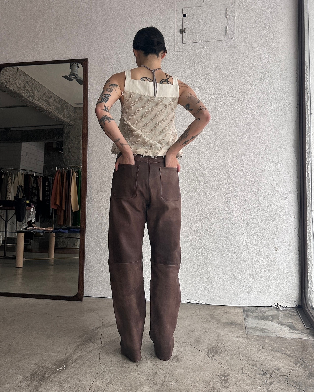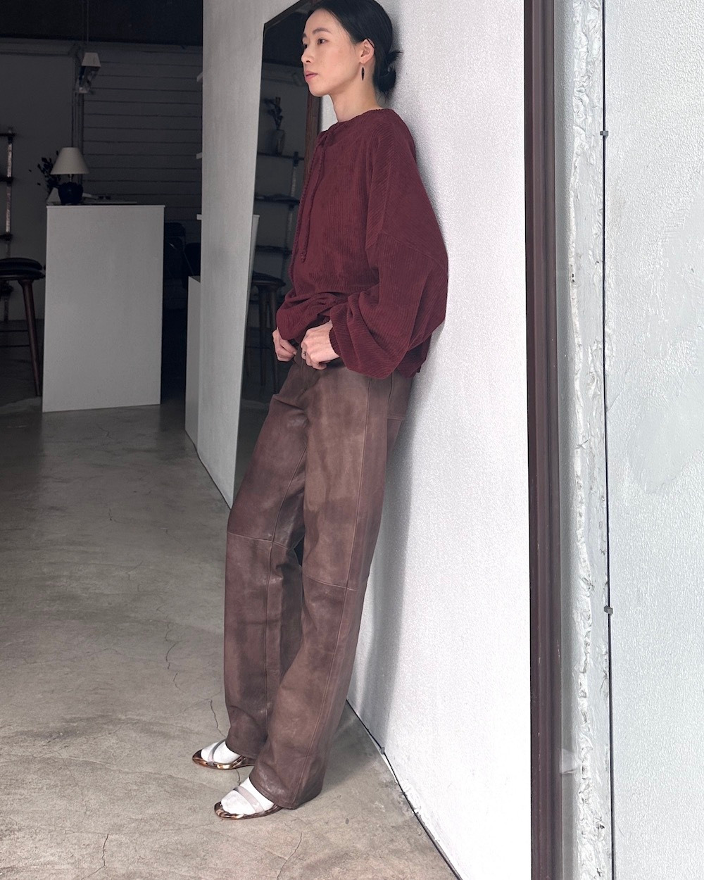 100% lamb leather made in China Size measurement 1 Length 106cm / Waist 72cm / Hip 64cm Our model 163cm in size 1