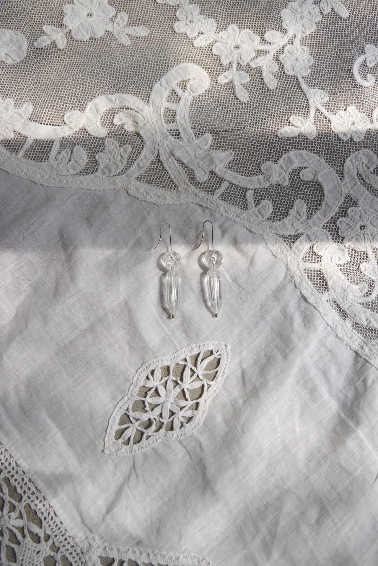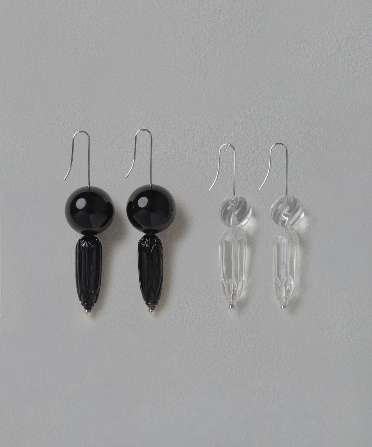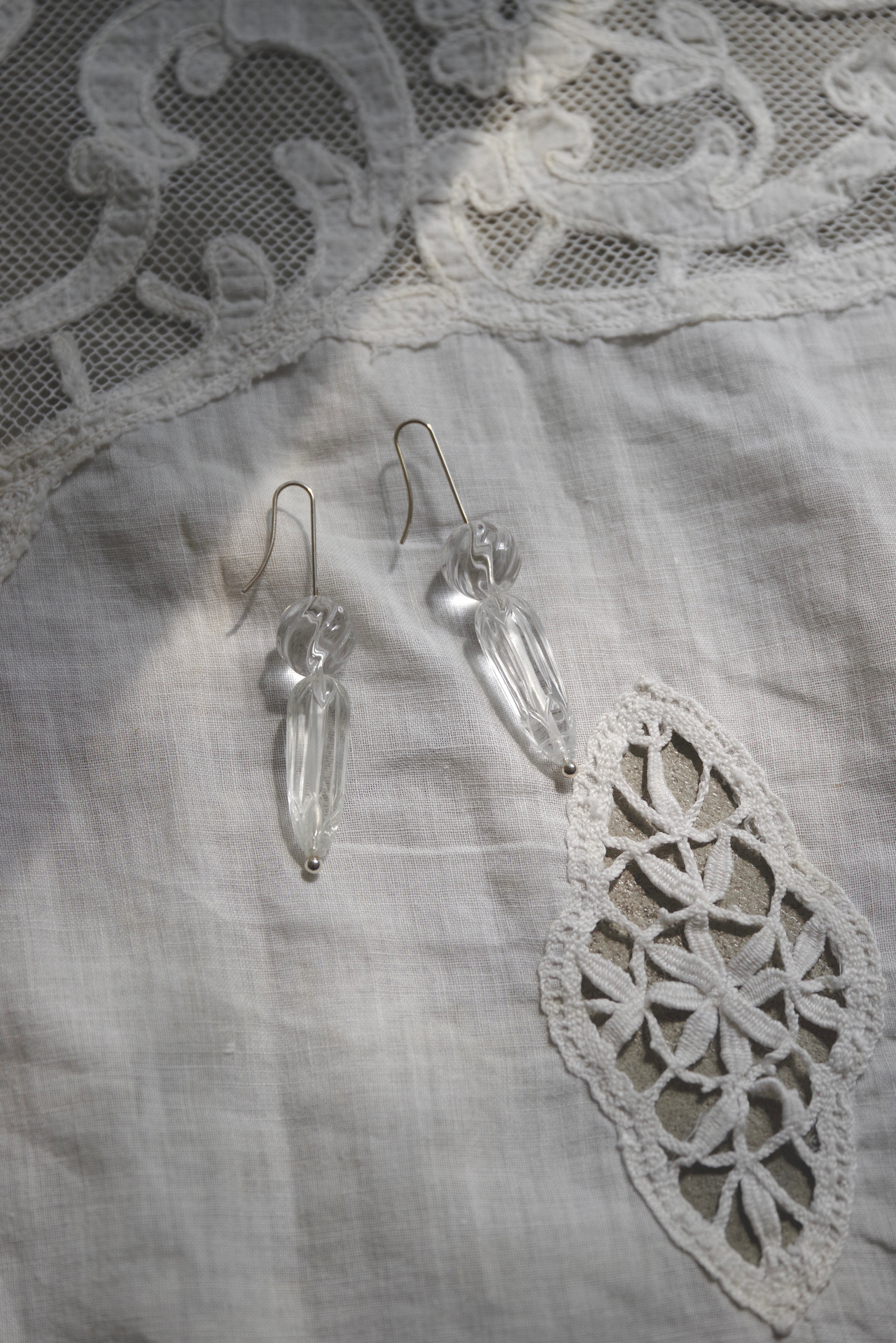 搭配刻有菱紋與巴紋般切割的水晶。菱形自古作為紋樣使用,相傳忍者在躲避追蹤時所撒的「撒菱」,其原型來自菱屬植物的果實。整體在保有和風意象的同時,也呈現俐落而現代的質感。刻意將耳針設計得較長,讓配戴時能展現自然垂墜的細微變化。