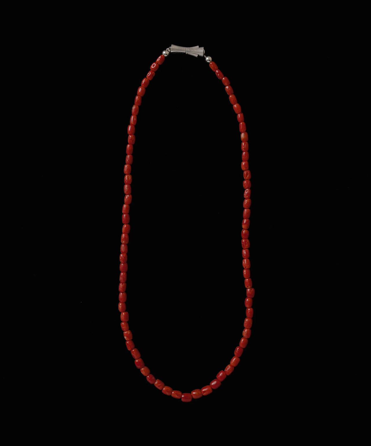 這款作品使用了天然珊瑚(coral)珠,是R.ALAGAN長期尋覓的稀有材料。因貿易條件限制眾多,能遇到狀態良好的珊瑚非常不容易,機會珍貴,本作品使用的是經過精挑細選的珊瑚。光澤美麗,尺寸統一,而天然珊瑚特有的個體差異也是其魅力之一。雖然越紅的珊瑚市場價值越高,但這次挑選的、呈現朱紅色的珊瑚極為罕見,美感出眾。