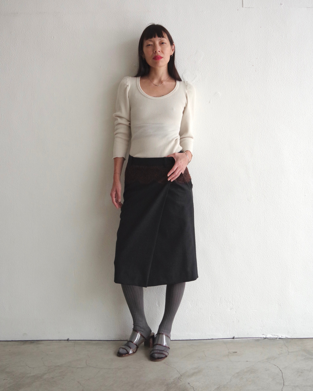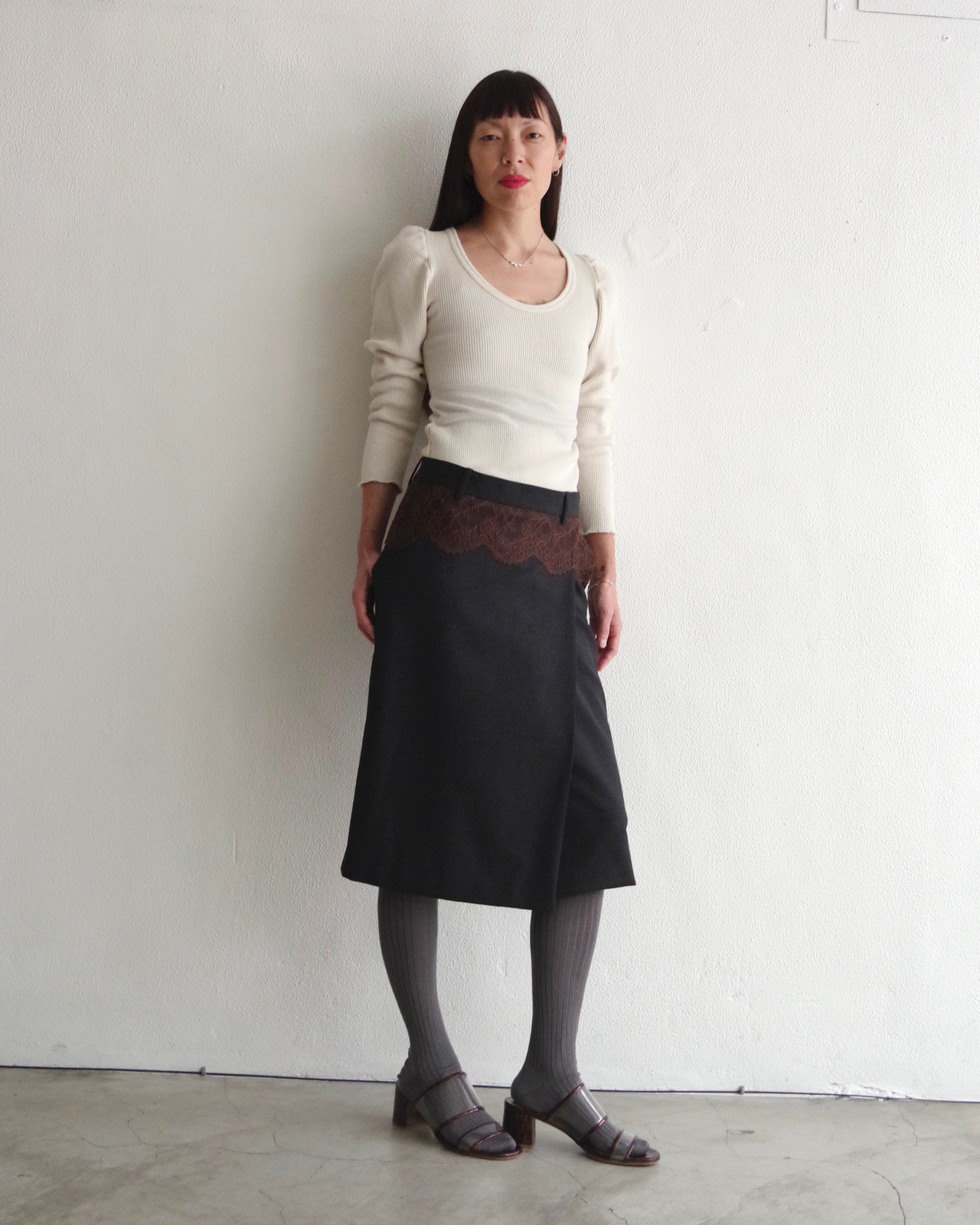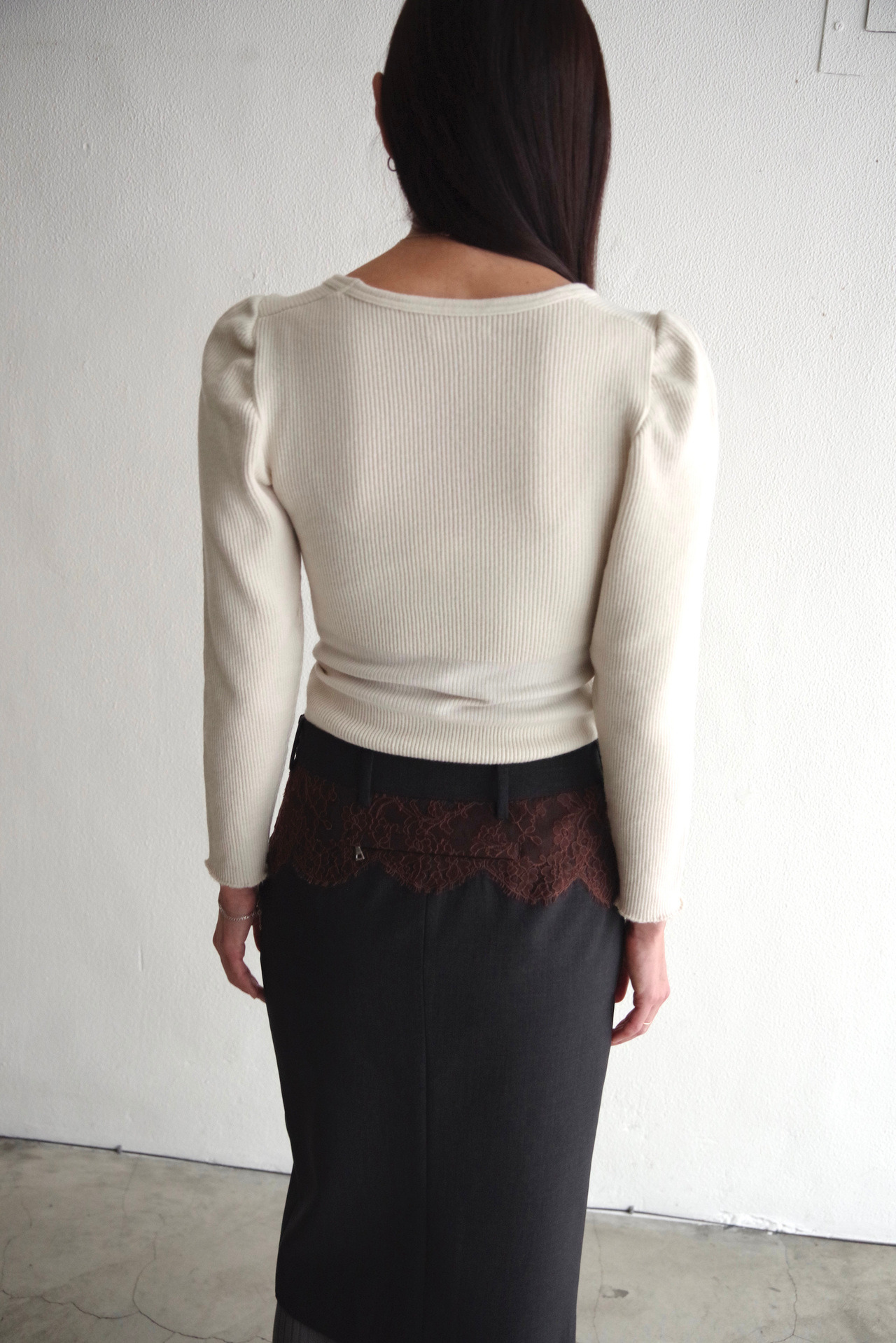 腰帶下方細緻的 Leavers 蕾絲細節,展現精緻的工藝感,為造型增添獨特的韻味。